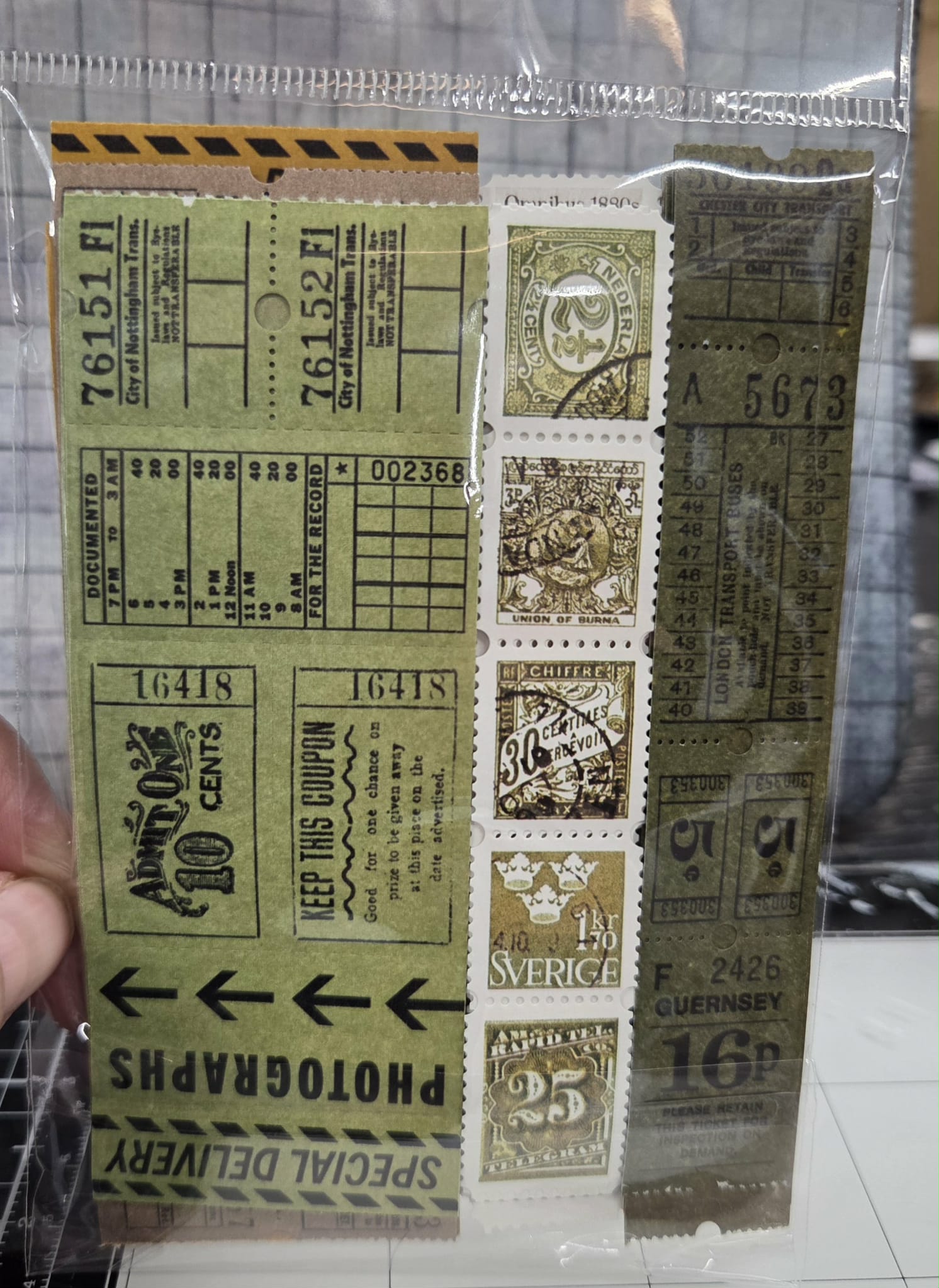 The vintage ephemera pieces are die-cut to create various ticket shapes and sizes.